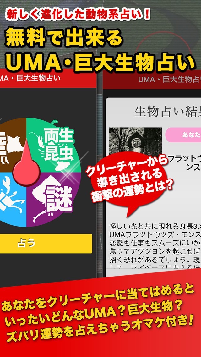 このアプリでは、様々な未確認生物についての情報を閲覧することができるようにしてくれます。まるで動物図鑑のように見ることができるので、楽しみながら確認することが出来ます。 その中から気になったものがあれば、右上のお気に入りによってあとですぐにチェックすることができるようになります。 中には、「チュパカブラ」や「ビッグフット」などといった有名なものも含まれています。 加えて、占いによっていろいろな変わった生物に例えてくれるので、友人と一緒に盛りあがるのにも使えます。