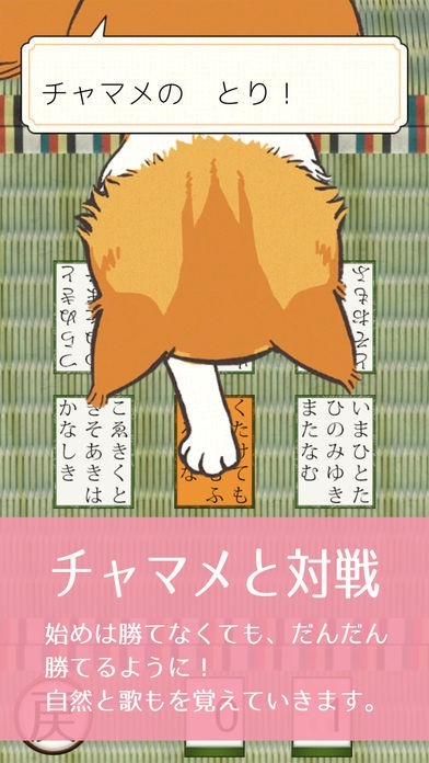 チャマメとはこのアプリの猫のキャラ。対戦モードではチャマメの強さから場の札の数、札の読み方などさまざまに設定できます。お母さんが忙しく相手をする時間が取れない場合でもこの対戦モードで習得度を試すことができます。