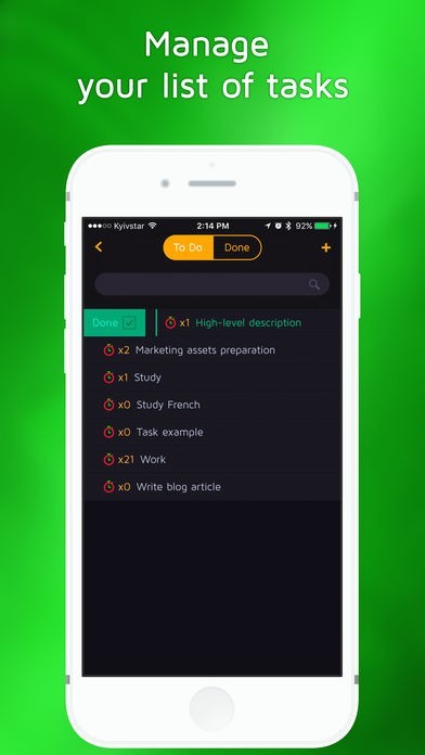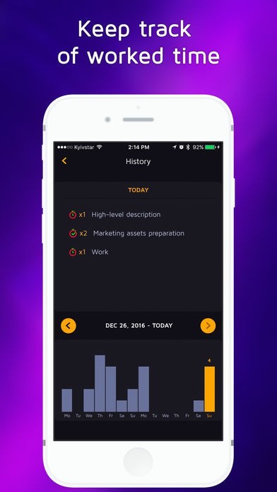 • Track your progress with insightful charts, see how many sessions you've spent for any separate task in any given day.