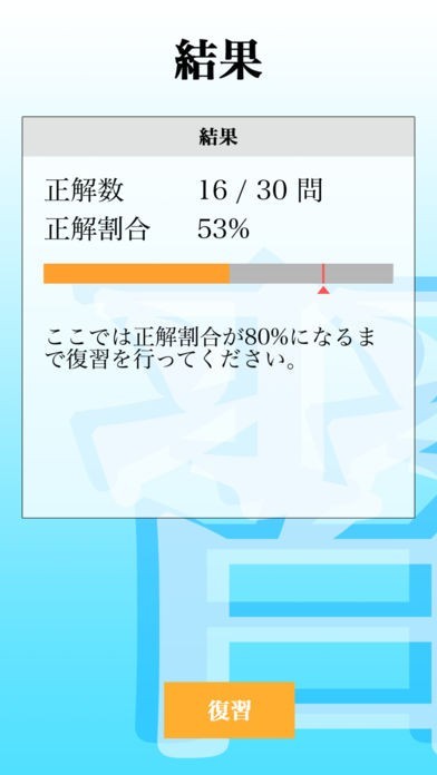試験では正解数はもちろんのこと、正解率も表示されます。その結果を踏まえて、ジャンルを選んで学習することができるので、集中的に苦手な部分を勉強することも可能です。