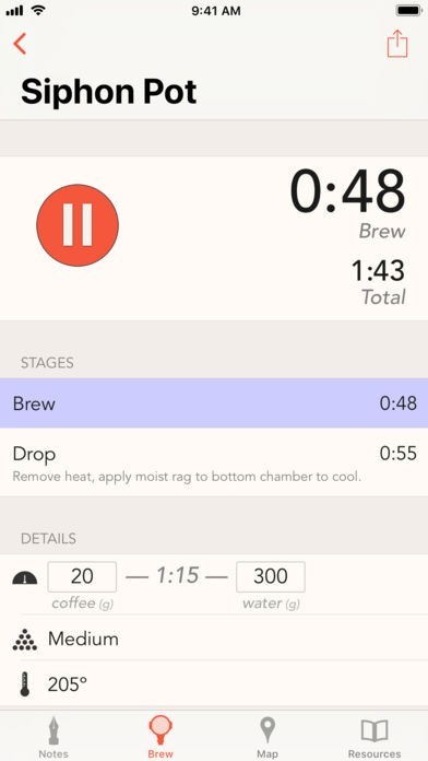 Brew timers make it easy to brew a great cup of coffee. Add your own custom timer, or use one of the stock timers courtesy of Corvus Coffee Roasters. Get brew notifications even if Press is closed, so you don't miss a step.