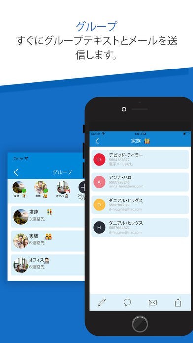 グループ機能を使用すると、選択したグループメンバー全員に一度にメッセージとメイルを送信できるため、時間を節約できます。クイックグループ機能を使用すると、ユーザはSMSやメールを事前に割り当てて、