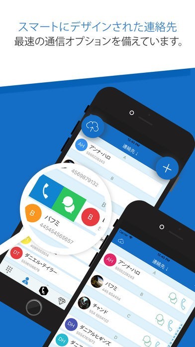 コンタクトブックのキャッチーで軽いUI。スワイプ機能を使用して簡単に電話とメッセージを送信できます。連絡先の写真をリストに直接表示し、連絡先の写真が割り当てられていない場合は、名字の頭文字を表示します。