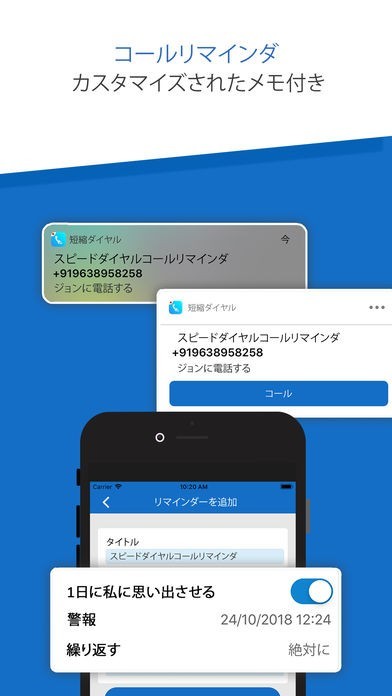 ユーザーは、スピードダイヤルの連絡先を長押しして、カスタマイズされたメモで複数のコールリマインダを設定できます。これは、メモと共に特定の時間にユーザーに思い出させるでしょう。ユーザーはそれを「1回」とすることができ、リマインダーを毎日、毎週、毎年繰り返すことができます。ユーザーは、すべての短縮ダイヤルの連絡先に必要な数のリマインダを設定できます。