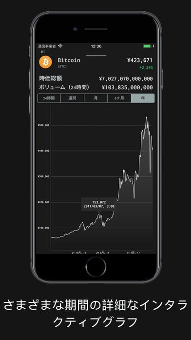 ビットコインなどの仮想通貨のリアルタイムレートを簡単にチェックすることができます。詳細なチャートで価格変動を見ることができ、短期の値動きから年単位の長期まで様々な分析が可能です。