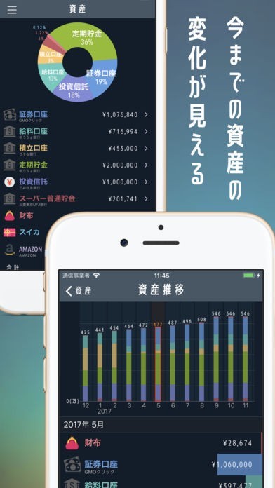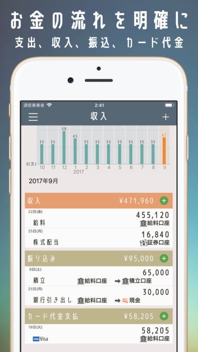 アプリに入力されたデータは様々なパターンのグラフでお金の収支を確認できるので、無駄遣いがなくなります。また記録したデータはクラウド上に保存もできるので過去のデータをいつでも見返せます。