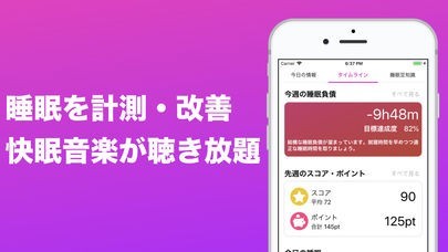 睡眠計測、分析、スコア・ポイント、睡眠負債バロメーター、眠りを誘う快眠音楽...。