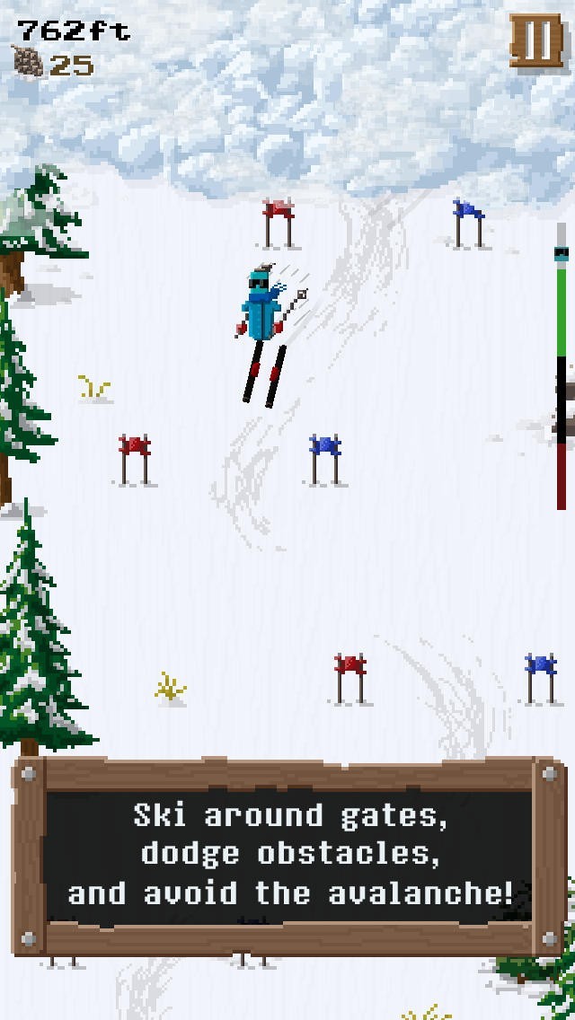 App Storeより引用Race down Shred Lord mountain as an avalanche chases after you. Ski between gates, dodge obstacles, discover the secrets of the mountain, and try making it all the way to the bottom.