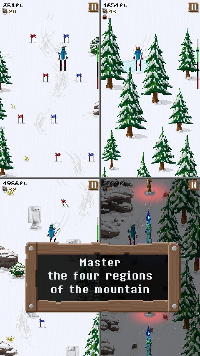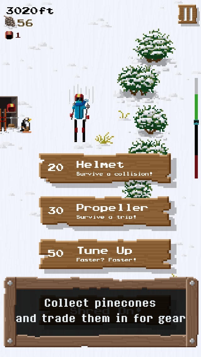 * Collect pinecones on the mountain to unlock shortcuts, and purchase gear to help you survive the mountain's many obstacles.