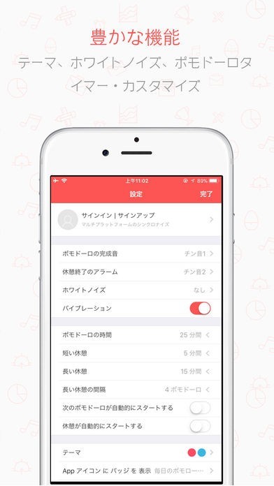 ちょっとした雑音が流れているほうが人間は目の前のタスクに集中することができます。本アプリでは、無音状態を避けるためにホワイトノイズを流す機能が搭載されています。
