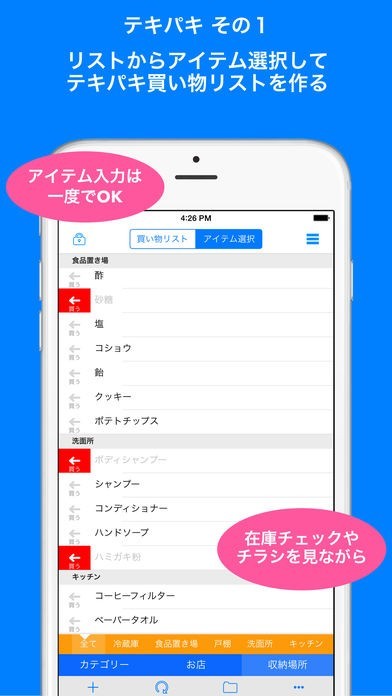 紙に書いたお買い物リストは作るのが面倒だし、見られると恥ずかしい。けれどもこれならタップで済むので買い物中も楽に見直せます