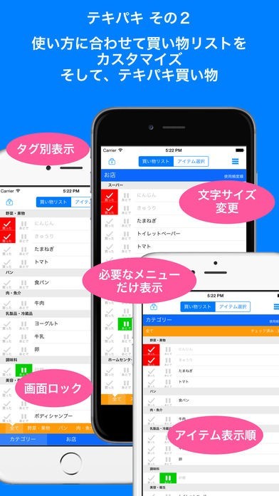 アイテムや商品がタグ別に管理出来るようになっています。また文字のサイズが変更出来るので、小さな画面でも快適に買い物リストの作成や閲覧が行えますね。リストを他のデバイスに共有出来るのもメリットです。