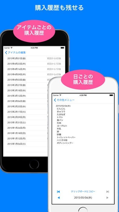 商品の収納場所を登録しておく事が可能なので、食材の在庫やアイテムの残量を把握したい時に役立ちますね。購入履歴が表示出来ると同時に、日付を閲覧していけるのも魅力です。