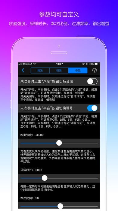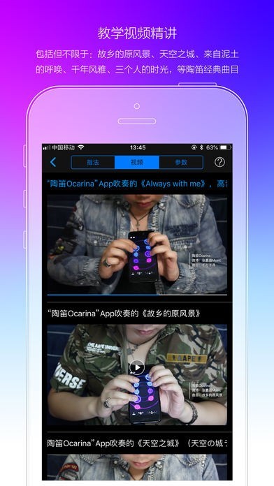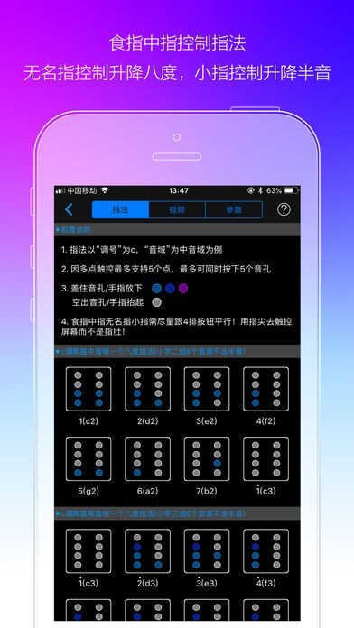 • 吹奏时,食指中指控制指法,无名指控制临时升降八度,小指控制临时升降半音,拇指用于掌控iPhone