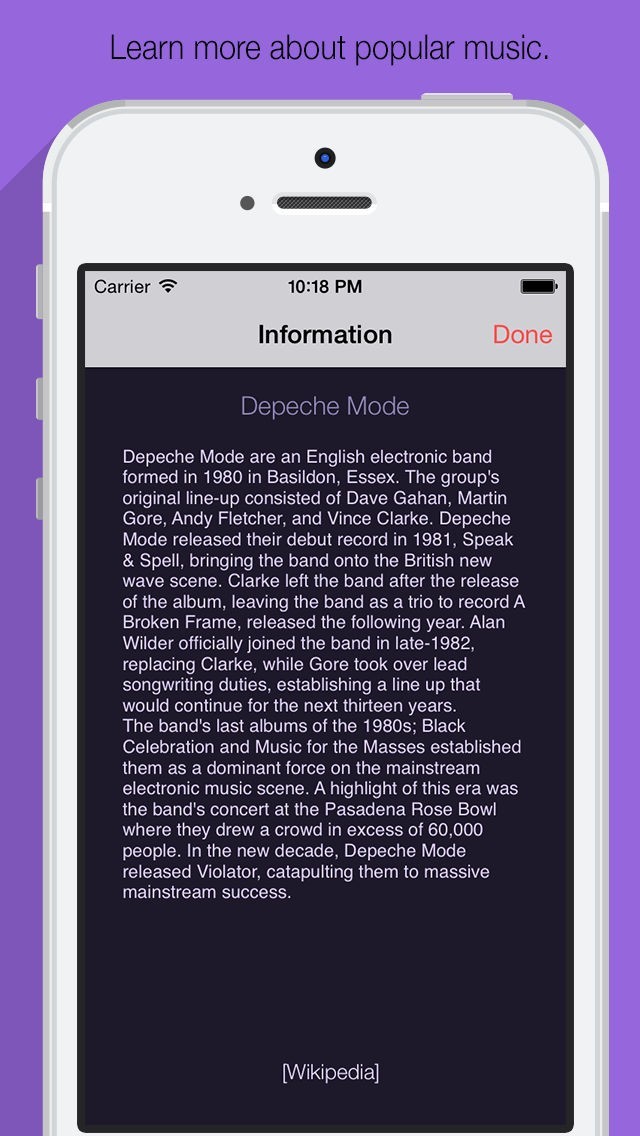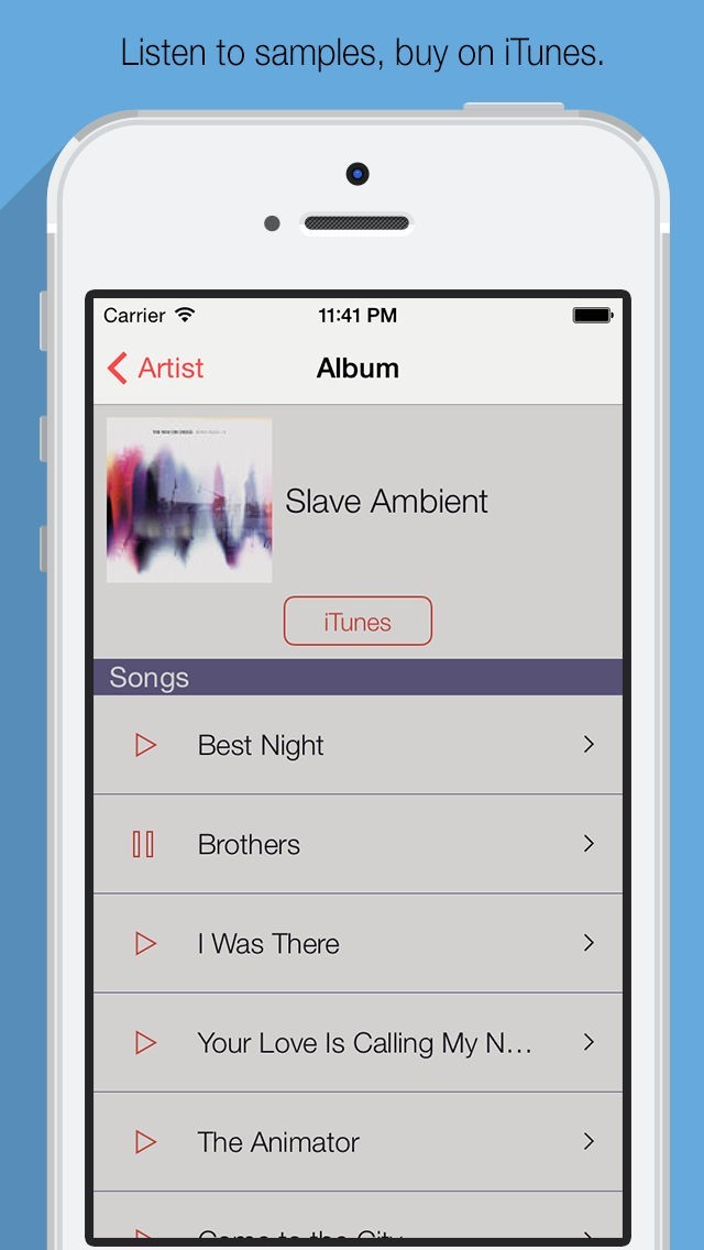 A perfect to do list for your music. Keep track of new artists you've just discovered. Watch their hot new music videos. Explore their discography. Listen for free to samples of their tracks. Read up on their story. Conveniently link to their iTunes music store page.