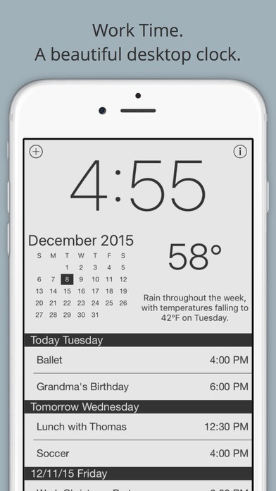 Don’t leave your iPhone asleep on your desk, put it to good use. Plug it in and use this App. Not just a clock, Work Time is your second screen. The time, date, calendar, your schedule of upcoming events, and current weather conditions all at a glance.