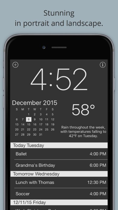 あなたの机の上に眠っているあなたのiPhoneを残していない、うまく利用してそれを置く。それをプラグインし、このアプリを使用。だけではなく、クロックは、作業時間は、2番目の画面です。時刻、日付、カレンダー、すべて一目で今後のイベント、と現在の気象条件のスケジュール。