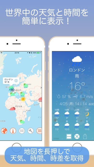 地図上で選択するだけで世界中の天気や気温、時差がすぐわかります。また、現在地の天気が変わったら通知でお知らせするので、外出前に折りたたみ傘や上着を準備することができます。