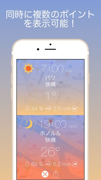 複数のポイントの天気を同時に表示できます。天気と気温を一度にチェックできます。