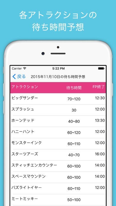 当日の待ち時間予想や、ファストパス終了時刻、休止アトラクション、開園時間も確認できます。