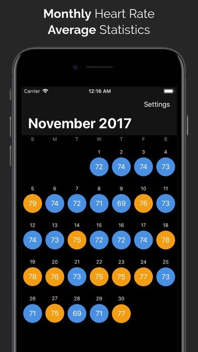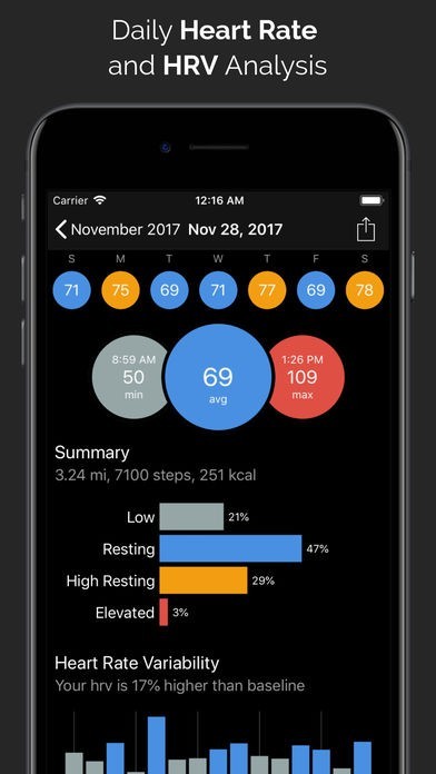 CardioBot is an iPhone app that reads heart rate data stored by the Apple Watch in HealthKit. The app separates readings in low, resting, high resting, and elevated heart rate through different colors and charts, allowing you to see averages at a glance.