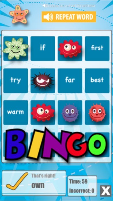 Listen to the word the BINGO Bug speaks and tap on the corresponding word on the screen. Get four words correct vertically, horizontally or diagonally to get BINGO and win! The quicker you get BINGO the better your score. Your score is based on time and the lower the score, the better. Earn a BINGO Bug when you beat your best score.