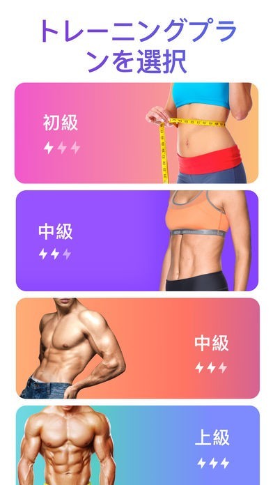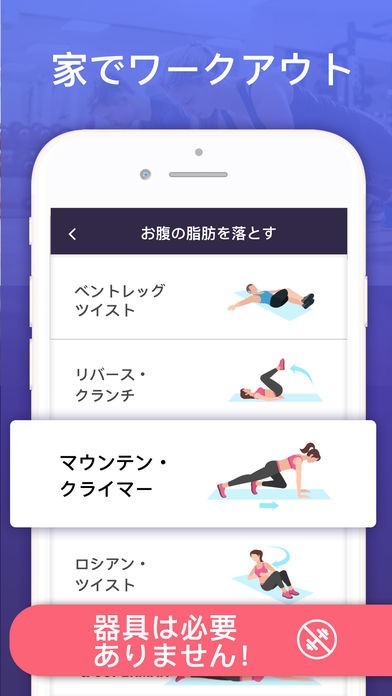 お腹周りの脂肪を落とすワークアウトのアプリです。ツイストやクランチなどいつでもどこでも手軽にできるトレーニングメニューで、特別な器具もトレーナーも必要ありません。 トレーニングプランは初級・中級・上級の3つから選択でき、それぞれ30日かけて徐々に低・中・高の3段階に難易度を上げていき、腹筋を強化するようにデザインされています。 それぞれのトレーニングがアニメーション化されているのでやり方が分かりやすく、またトレーニングポイントを音声で説明してくれるので効率的なトレーニングを行うことができます。 朝晩に行うストレッチの方法や、体重やカロリー燃焼量などの体調管理もできるので便利です。
