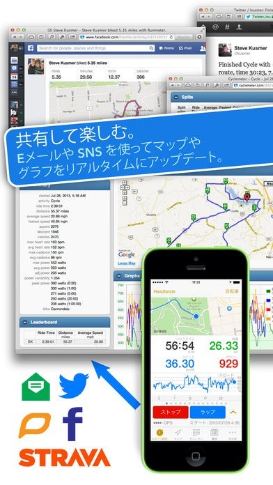 アプリにはメールやSNSでシェアする機能が付いています。走行中のマップやグラフを仲間に送信することができます。仲間に走行中の状況を伝えて、アドバイスをもらいましょう。