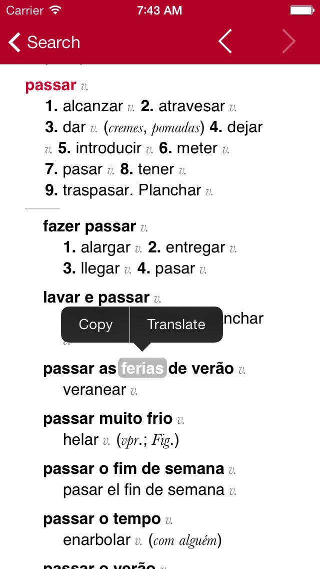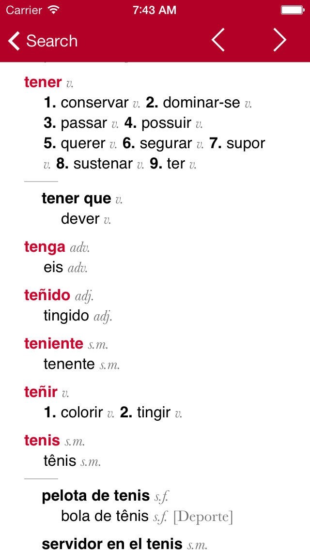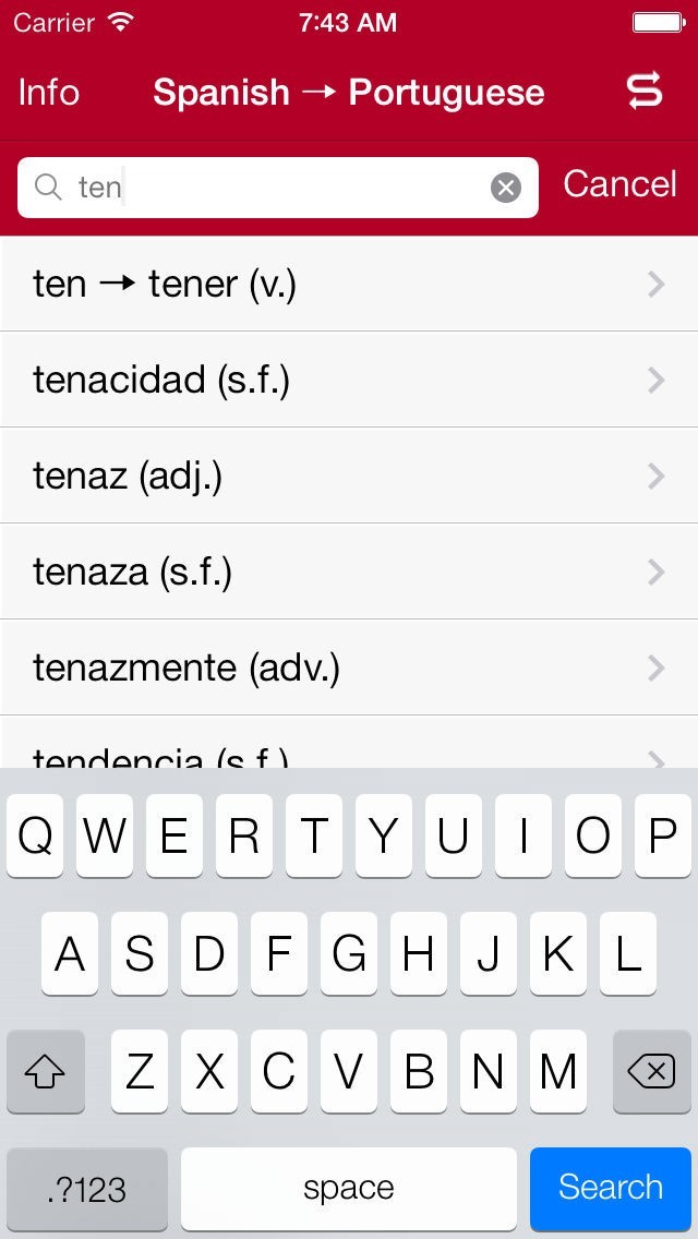 • Easily switch from Spanish-Portuguese to Portuguese-Spanish with bidirectional look-up