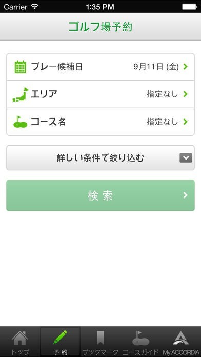 日本最大級のゴルフ場運営会社アコーディアゴルフのゴルフ場をスマートフォンから検索、予約をすることができるので、ちょっとした空き時間に週末のゴルフの予約をすることができます。