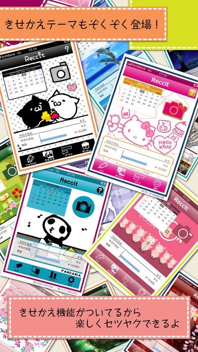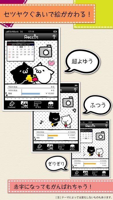 アプリ画面は着せ替えが可能となっており、気分によって背景をかえて楽しむことが出来ます。節約具合によってキャラクターの表情が変わるなどの機能もあり、赤字になっても節約ががんばれます。