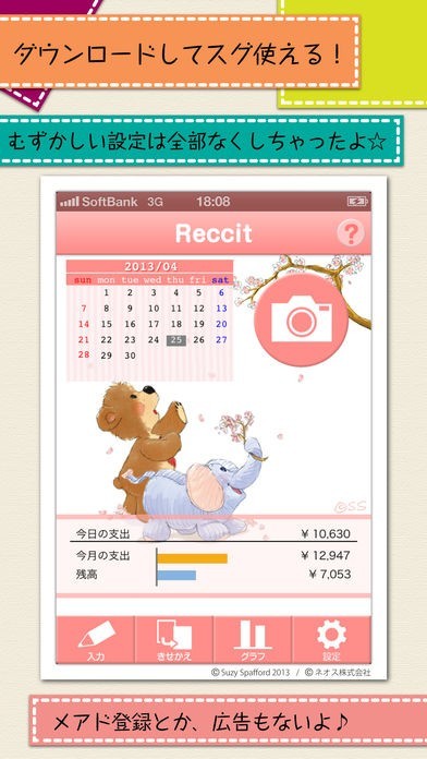 レシートをカメラで撮影するだけで家計簿がつけられる便利アプリです。ノートに家計簿をいちいちつけたり、管理するのが面倒な方におすすめです。レシートを撮影し、とりあえずアプリ内に金額をパッと入力するだけでOKなので、誰にでも簡単にできます。日付や店舗の名前は後から時間がある時に簡単に編集できますので、便利です。また、アプリ画面も可愛く自分で着せ替えることができますので、アプリを開くのが楽しみですし、女性にとっては嬉しい特典です。