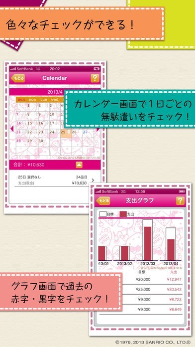 カレンダーやグラフから無駄遣いをチェックできる