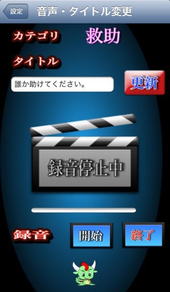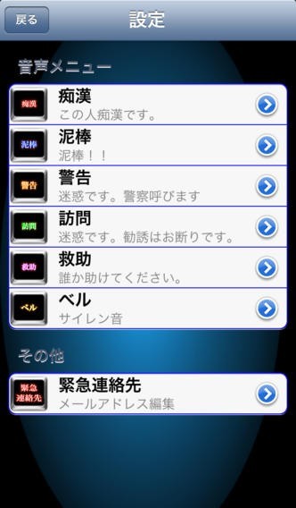 App Storeより引用いつどこでトラブルに巻き込まれるかわかりません。 トラブルに巻き込まれた際に、あなたをお助けする防犯アプリです。 目的別に音声を録音し、トラブルが発生した際に該当する音声を再生することができます。 また、緊急の際は位置情報を取得し現在地を登録したメールアドレス宛に通知することが 可能です。