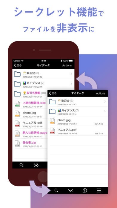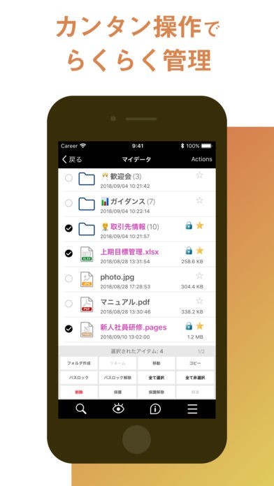 ファイルの整理がしやすいインターフェイスだし、見られたくないファイルは非表示にできる。使いやすいアプリだと思います。
