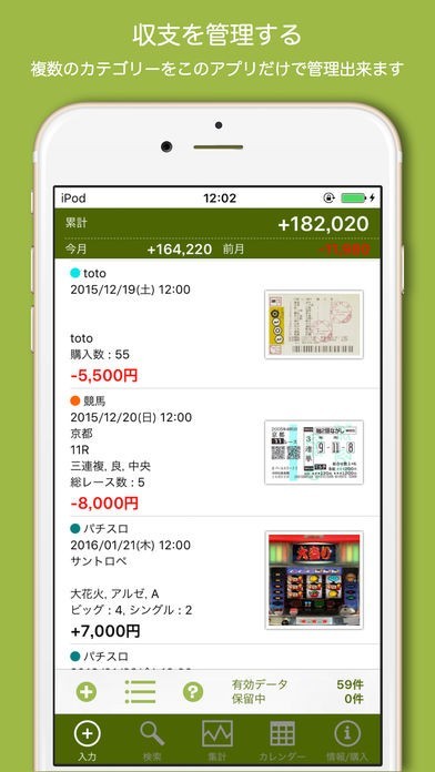 宝くじやギャンブルの収支管理がOK!ギャンブルのカテゴリーを自由に追加できる!