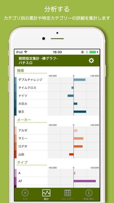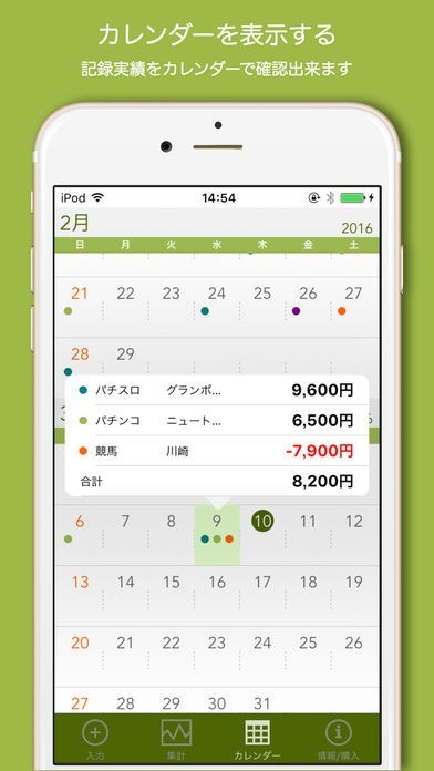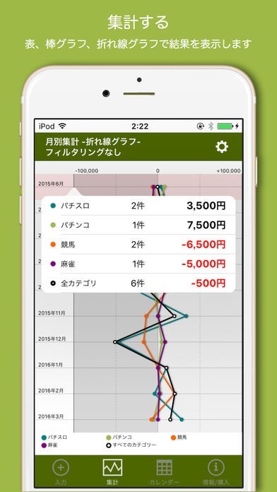 競馬やパチンコ、麻雀や宝くじなど、自分な好きなギャンブルのカテゴリーを自由に追加して、収支を管理したり、表やグラフで実績を集計します。カレンダーでも毎日の実績を確認できます。