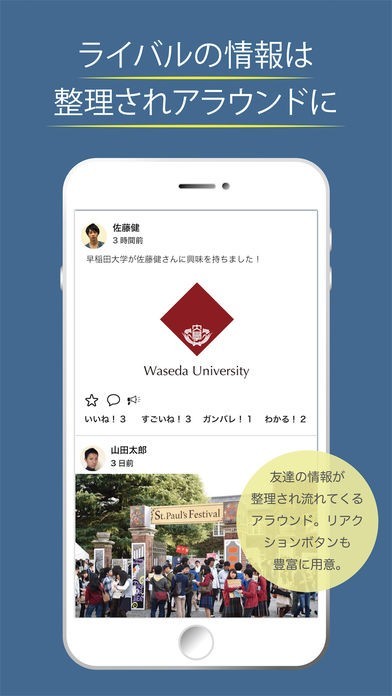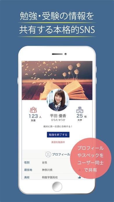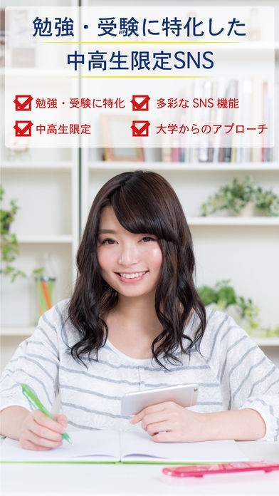 中高生に限定し受験生同士のコミュニケーションがとれるSNSアプリです。毎日の勉強報告や受験の情報などを報告しあってモチベーションを高めます。また、大学からの説明会案内なども受け取ることができます。