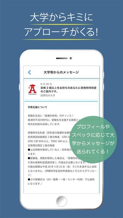 大学から自分のプロフィールやスペックに応じて様々なメッセージが送られてきます。大学のニュースやオープンキャンパスの案内など、メッセージを受け取ることで興味のなかった大学や学部の新たな魅力を発見するきっかけになるかもしれません。