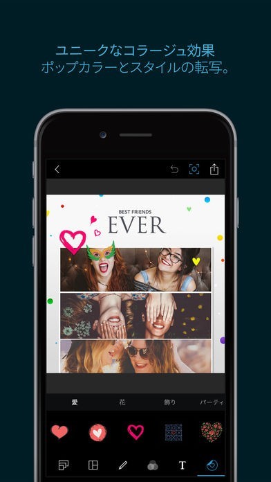Adobe Photoshop Express:画像 加工では、人物写真の赤目補正や写真へのフォントや枠線の追加でのデザイン化などが行えるようになっており、複数の写真をコラージュすることもできます。