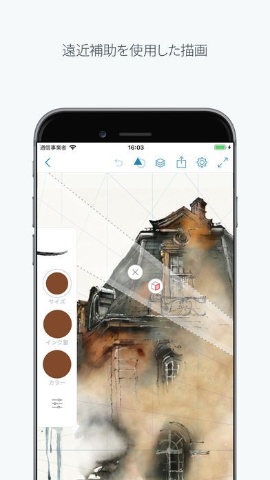 フリーハンドだけではなく、アプリではグリッド線を予めキャンバスに表示することができます。また建物などを描く時に使用するシェイプも設定でき、本格的なイラストの制作もできます。