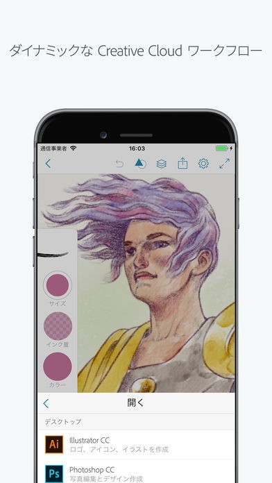 画面に描くことができるブラシの自由度だけではなく、カラーサークルによって選択できる色の範囲は幅広くなっています。また色の濃度、透明度やブラシサイズをアプリで調整可能です。