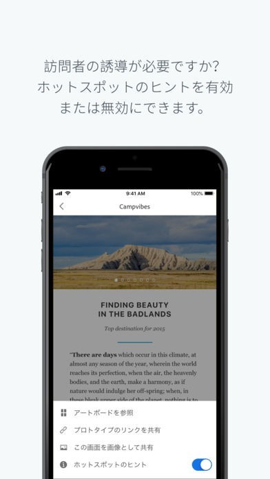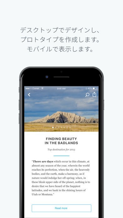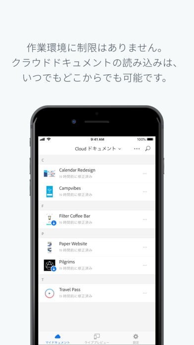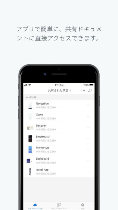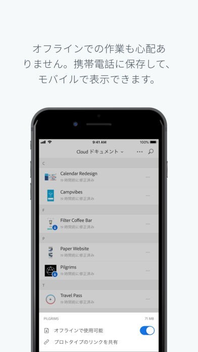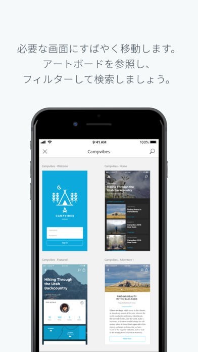 App Storeより引用Adobe XD でのデザインのプレビューによる当て推量の排除、ネイティブデバイスでのトランジションによる完了を、USB、またはクラウドドキュメントとしてのローディングを通して、リアルタイムで行えます。