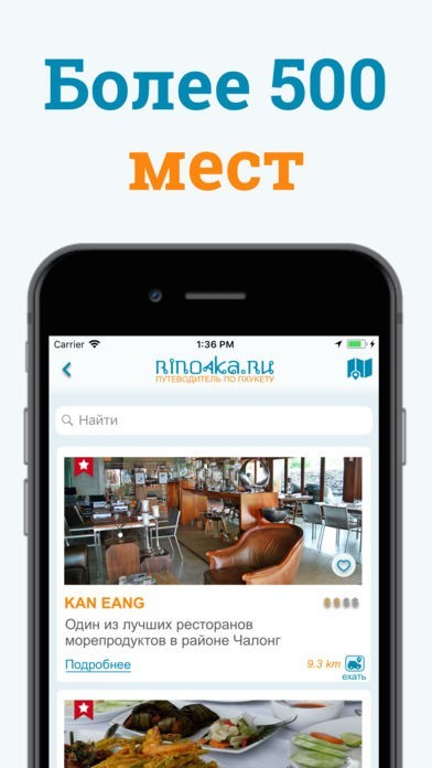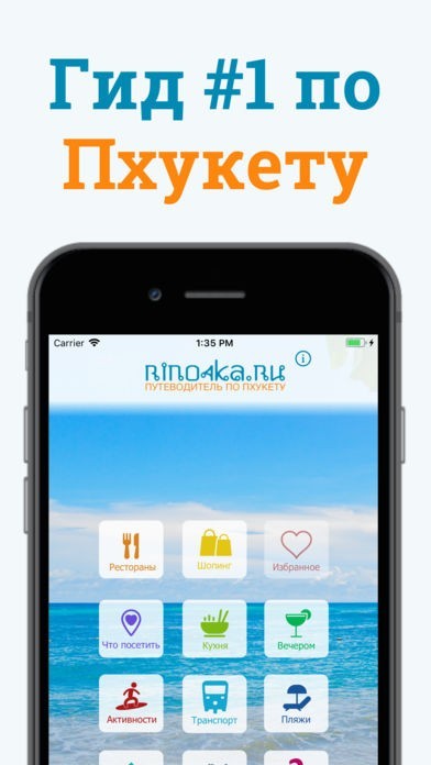 Великолепные пляжи и старинные храмы, места для встречи заката, кафе и рестораны, бары, ночные и пляжные клубы, супермаркеты, рынки и ярмарки, массажные салоны, спа-центры, детские достопримечательности, китайско-португальская архитектура, фирменная кухня острова — в мобильном гиде есть всё, чтобы с пользой провести время на острове Пхукет. Информация была собрана для вас автором сайта Rino4ka.ru. Каждое место сопровождается описанием и фотографиями, рейтингом и порядком цен, контактами и расположением на карте. Для поиска доступны несколько вариантов: по тематике, выбор из общего списка, в алфавитном порядке, по расположению и возможность создать индивидуальный список интересных мест. Информация сохраняется на вашем телефоне и будет доступна даже без интернета.