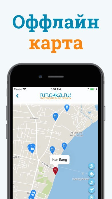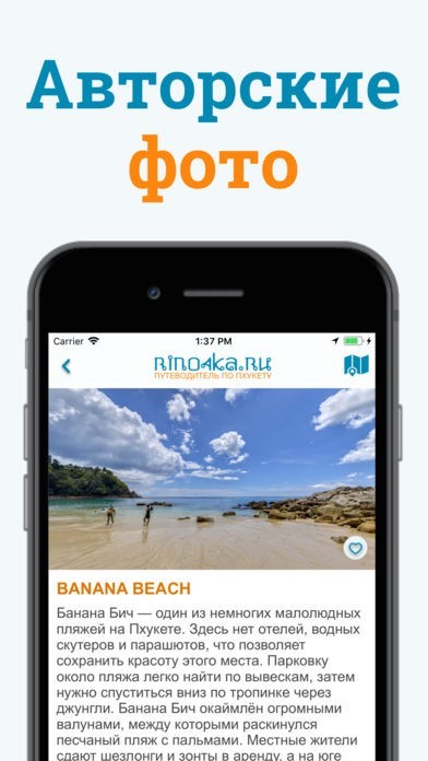 App Storeより引用Приложение "Пхукет - гид от Rino4ka.ru" — это ваш личный гид по всем интересным местам острова. Достопримечательности и рестораны, природные объекты и популярные туристические места, описание пляжей и развлечений для детей — всё теперь доступно в телефоне без подключения к интернету. Достаточно установить приложение — и необходимая информация будет в вашем кармане.