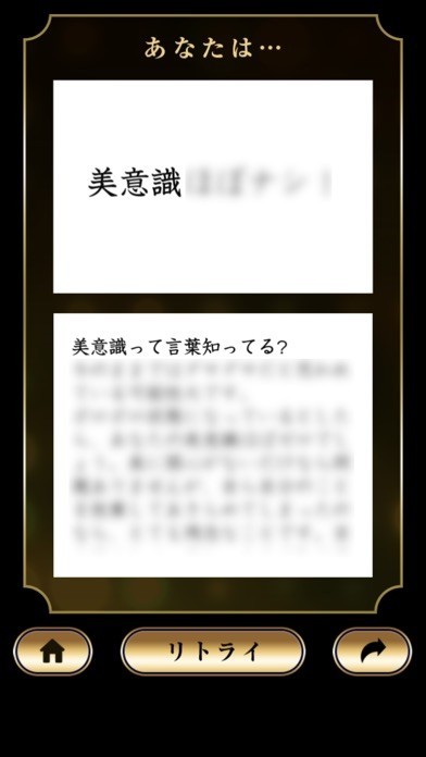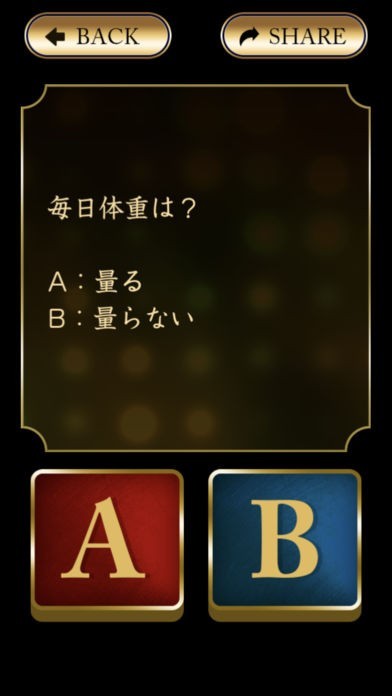 画面上部に問題文、画面下部に2つの回答ボタンが表示されます。自分のいつもの行動に近い方をタップしてください。最後まで問題を解くと、詳しい結果が画面で見られます。