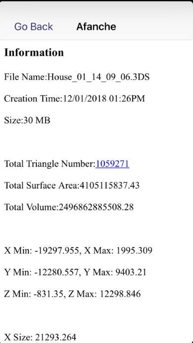 The app provides many 3D features including rotating model with finger movement, zooming in/out, panning, changing color, changing light intensity, etc. You can also choose to display it in shading model, or wireframe mode. The app supports loading multiple models at the same time so that you can view them together. It is extremely helpful when you want to compare your data sets to make sure everything works correctly. You can also use the app to figure out basic dimensions of your model, for instance, the length along x, y or z direction, total surface area, total volume, etc.