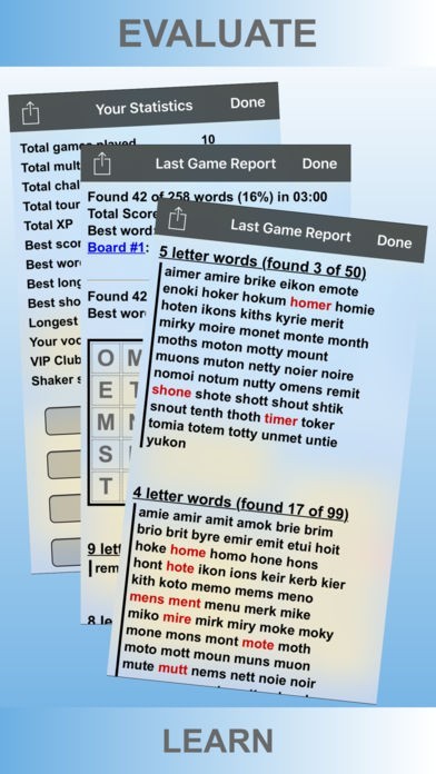 - Full report of found and missed words after a game