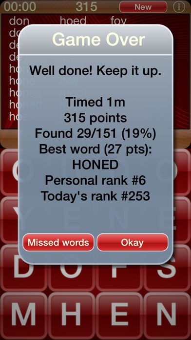 利用場面に合わせて最短1分から最長30分まで制限時間をチョイスしてゲームを楽しめます。ルールもシンプルで4×4マスの計16マスに表示された英語スペルを組み合わせて、できるだけたくさんの英単語を見つけ出すだけとシンプルで誰でも楽しめます。