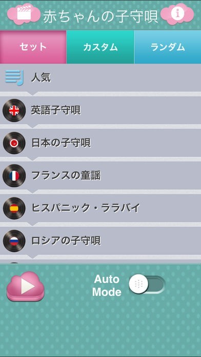 "赤ちゃんの子守唄"は、お子様を寝かしつける時に大変便利な機能が満載の子守唄アプリとなっています。本アプリの優れた機能として、お子様が泣き出したり、大きな声で騒ぎはじめると、その声に反応して子守唄や音を自動的に流してくれる察知機能があります。流れる子守唄や音は予め収録されたものから選択可能な他、ママやパパの歌や声を録音することができる機能も備わっています。また、ビデオ上映機能を搭載しており、子守唄や音に加えて、お子様が喜ぶビデオや人物アニメを見る事ができるなど、お子様の寝かしつけはもちろん、ちょっと手が離せないシーンなどで、小さなお子様をあやしておくのに最適です。